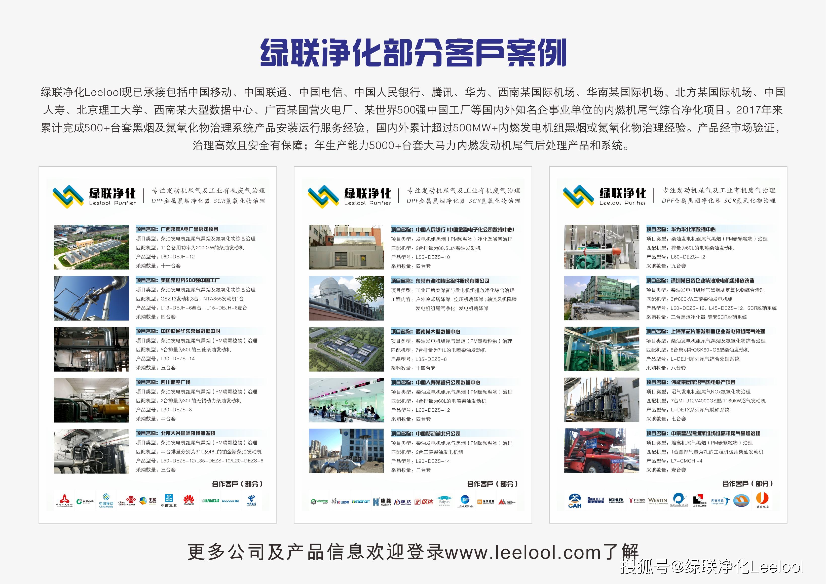 綠聯(lián)凈化Leelool現(xiàn)已承接包括中國移動、中國聯(lián)通、中國電信、中國人民銀行、騰訊、華為、西南某國際機場、華南某國際機場、北方某國際機場、中國人壽、北京理工大學(xué)、西南某大型數(shù)據(jù)中心、廣西某國營火電廠、某世界500強中國工廠等國內(nèi)外知名企事業(yè)單位的內(nèi)燃機尾氣綜合凈化項目。2017年來累計完成500+臺套黑煙及氮氧化物治理系統(tǒng)產(chǎn)品安裝運行服務(wù)經(jīng)驗,國內(nèi)外累計超過500MW+內(nèi)燃發(fā)電機組黑煙或氮氧化物治理經(jīng)驗。產(chǎn)品經(jīng)市場驗證,治理高效且安全有保障;年生產(chǎn)能力5000+臺套大馬力內(nèi)燃發(fā)動機尾氣后處理產(chǎn)品和系統(tǒng)。